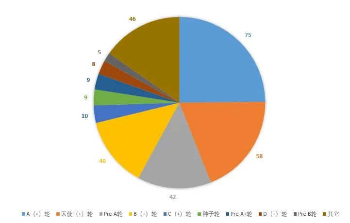 在新锐公司的整个融资链条中,早期投资的风险相对较大。而从我们统计的结果来看,早期融资依然是2022年投融资市场最活跃的部分。在我们统计的300多起融资案例中,早期融资案例有198起,占到了总数的约65%。其中, A(+)轮融资案例最多,有75起;其次是天使(+)轮,有58起;然后是Pre-A轮,有42起。