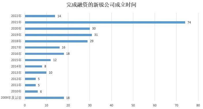 从成立时间来看,在我们统计的276家公司中,于近三年(2020-2022年)内成立的公司有118家,占到了约43%;2015-2019年间成立的公司有106家,占比约38%;2014年及其以前成立的公司有52家,占比约19%。按单一年分来看,2021年成立的公司数量最多,高达74家。