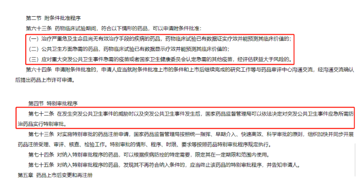 另一个则是在2020年新修订的《药品注册管理办法》,分别有附条件批准、优先审评审批和特别审批程序三类药品加速上市的方法。