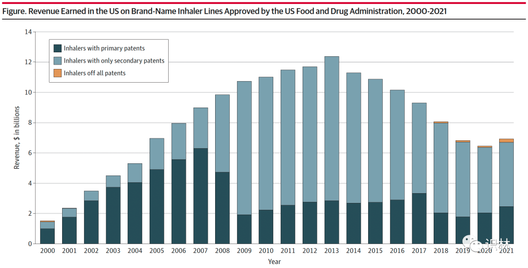 JAMA 的这篇文章表明,从 2000 年到 2021 年,制药商列出的二级专利比主要专利“多得多”,并且在活性成分到期后赚取了“多得多的收入”。研究称,在研究期间,制药商在仅受二级专利保护的吸入器上赚取了约 1103 亿美元,其中 98% 的收入是在没有面临仿制药竞争时期产生的。