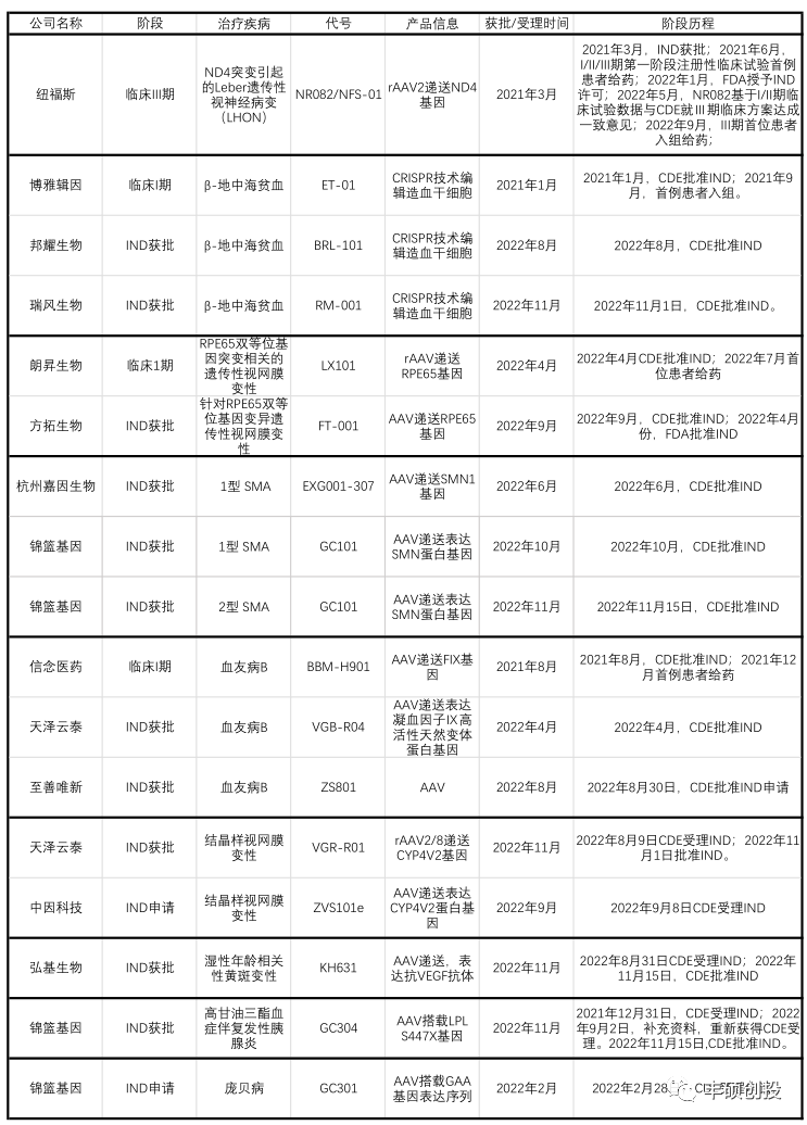 图4 国内临床/IND申请阶段基因治疗公司管线情况(来源:各公司官网及公开资料,丰硕创投整理)