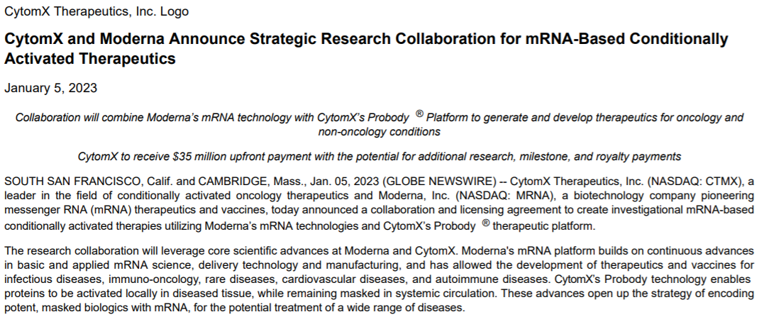 2023年1月5日,Cytomx宣布与Moderna达成合作协议,共同开发mRNA表达的前抗体新药。
