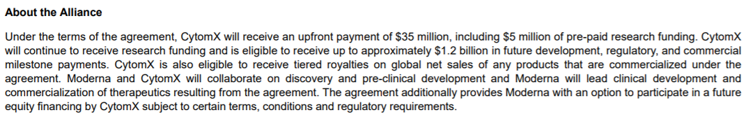 根据协议,Moderna支付3500万美元预付款(包括500万美元研发费用),12亿美元里程碑金额,以及一定比例的销售分成。