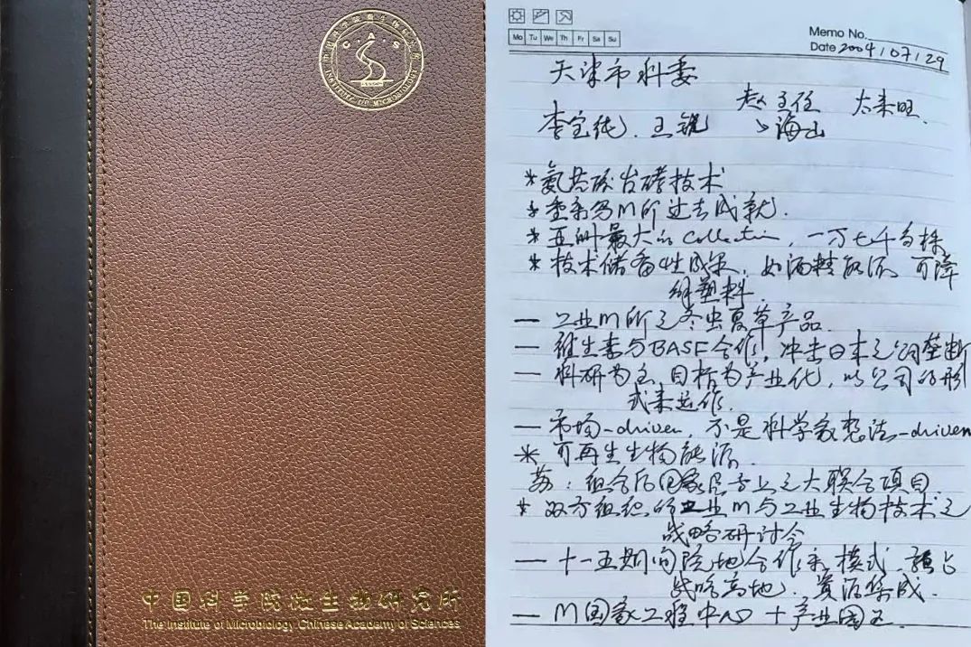天津在工业生物技术领域有着悠久的历史,天津市设立有工业微生物研究所,更为重要的是中科院没有在天津布局任何方向的研究所,因此,建立天津工业生物技术研究所就成为我们新任领导班子(我们领导班子包括:谭华荣书记、王大立副书记、孙玉琴副所长和黄亦存副所长,后来黄亦存副所长调离由马树恒副所长接任) 的计划。2004年7月29日第一次拜访天津市科学技术委员会,李家俊主任、赵海山副主任、李宝纯处长 (后任天津工业生物所党委书记) 等接待了我们,中科院苏荣辉处长(后任生物局副局长和学部局副局长) 一起去调研(图1展示了当时的会议记录)。第二次,8月24日,陪同陈竺副院长会见天津科委李家俊等;11月6日,再次拜访天津市科委;12月27日所务会讨论决定在天津开展两个项目 (建立研发基地和联合中心) 的可行性,从此天津工业生物技术研究所的雏形诞生。