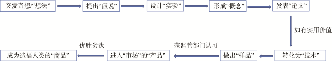 回顾自己回国近20年的科研历程,尤其是这次应对新冠大流行中疫苗、抗体和药物的研发[9],我觉得一个从事基础 (科学) 研究的科学家同样可以做出解决实际 (技术) 问题的实用工作,如果能有产业部门 (工程) 的合作,一定可以做出解决国计民生问题的产品与商品。因此,我建议从事基础研究的科学家可以按照以下9个层次思路做好科研工作 (图4):(1) 首先是科学灵感突发奇想/“想法”;(2) 有了基本“想法”,然后就是大胆自由地提出“假说”;(3) 根据假说设计“实验”,验证想法与假说;(4) 根据实验结果我们就会形成一个“概念”;(5) 对于自己形成的概念需要经过同行评审与批判,这就是我们经常讲的科学家要发表“论文”,让全世界同行、甚至非同行在科技期刊这样的平台来审读点评,如果是经得住考验的科学发现,自然就是大家认可的;(6) 假如这个发现有实用价值,那就可以转化为“技术”,再依此技术做出“样品”;(7) 如果样品被市场看好,可进一步与企业合作,获监管部门认可后,则形成“成品”或“产品”;(8)进入市场,参与竞争,优胜劣汰,最终靠得住胜出的,自然就成为服务社会、造福人类的“商品”了;(9) “商品”是经得住激烈竞争的“人民需求”,有的会经久不衰,有的经过一段时间可能被取代,从而又回到新“想法”开始的逻辑链。