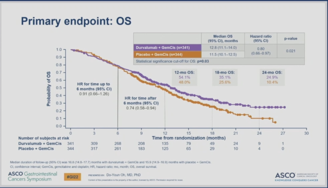 2022年1月,在2022年美国临床肿瘤学会胃肠道癌症研讨会(ASCO GI)上公布了度伐利尤单抗联合化疗在未经系统治疗的晚期胆道系统肿瘤患者中开展的III期研究(TOPAZ-1)数据。结果显示,度伐利尤单抗联合化疗组的死亡风险相比单独接受化疗降低了20%。随访18个月时,度伐利尤单抗联合组的总生存率为35.1%,而单独化疗组的总生存率为25.6%。随访至2年时,两组总生存率分别为24.9%和10.4%。