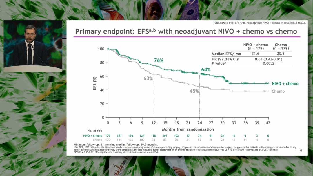 首次公布的EFS数据显示,术前接受纳武利尤单抗联合化疗的患者疾病复发、进展或死亡风险降低了37%(HR 0.63,p=0.0052),纳武利尤单抗联合化疗组的中位EFS为31.6个月,单用含铂双药化疗组的中位EFS为20.8个月。