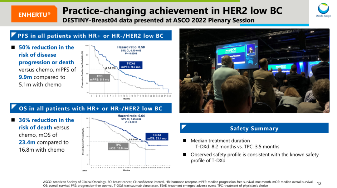 结果显示,HR+人群中,T-DXd组和TPC组的PFS分别为10.1个月和5.4个月(HR=0.51,P<0.0001);总人群中,T-DXd组和TPC组的PFS分别为9.9个月和5.1个月(HR=0.50,P<0.0001)。OS方面,HR+人群中,T-DXd组和TPC组的OS分别为23.9个月和17.5个月(HR=0.64,P=0.0028);总人群中,T-DXd组和TPC组的OS分别为23.4个月和16.8个月(HR=0.64,P=0.0010)。