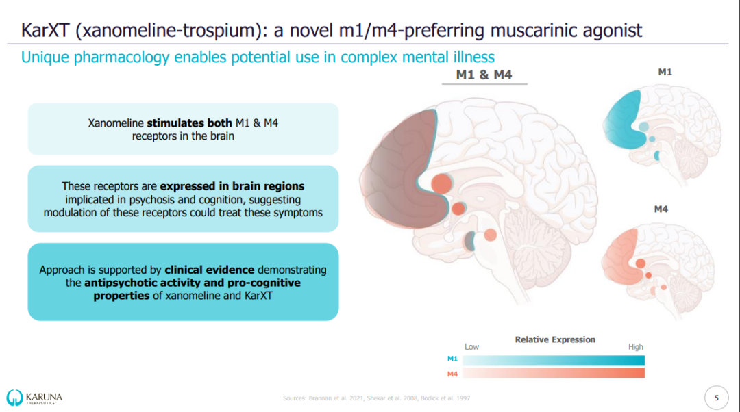 KarXT(xanomeline-trospium)是一种口服M1/M4毒蕈碱激动剂,由毒蕈碱激动剂 xanomeline和毒蕈碱拮抗剂trospium组成,旨在优先刺激中枢神经系统中的毒蕈碱受体,缓解负面症状,如冷漠、社会驱动力减少、提高认知能力,并对改善其它精神症状,如幻觉和妄想很有帮助。季铵盐化合物trospium chloride为毒蕈碱受体拮抗剂,可抑制xanomeline于外周神经中的副作用。KarXT正在开发中用于治疗精神和神经疾病,包括阿尔茨海默病中的精神分裂症和精神病,有潜力成为第一款非靶向多巴胺能与5-羟色胺能路径,并具双重机制的新式药物。