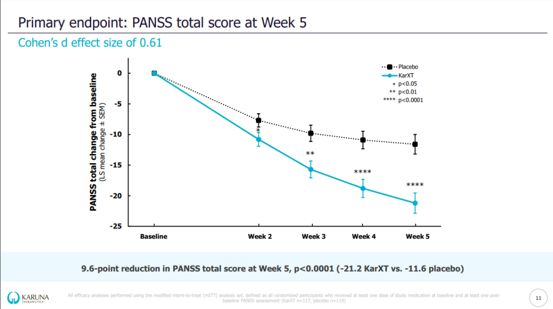 EMERGENT-2试验是一项双盲、安慰剂对照、为期五周的III期临床研究,主要评估KarXT与安慰剂相比在美国成年精神分裂症患者中的疗效、安全性和耐受性状态。主要终点是第5周时与安慰剂相比,KarXT阳性和阴性症状量表 (PANSS) 总分(衡量精神分裂症症状严重程度的量表)相对于基线的变化。结果显示,与安慰剂相比,5周后,KarXT组的阳性和阴性症状量表总分,与基线相比显著降低9.6分(p<0.0001)。该研究还达到了关键的次要终点,表明根据 PANSS阳性、PANSS阴性和PANSS阴性Marder因子分量表测量,精神分裂症的阳性和阴性症状都在统计学上达到显著减少。