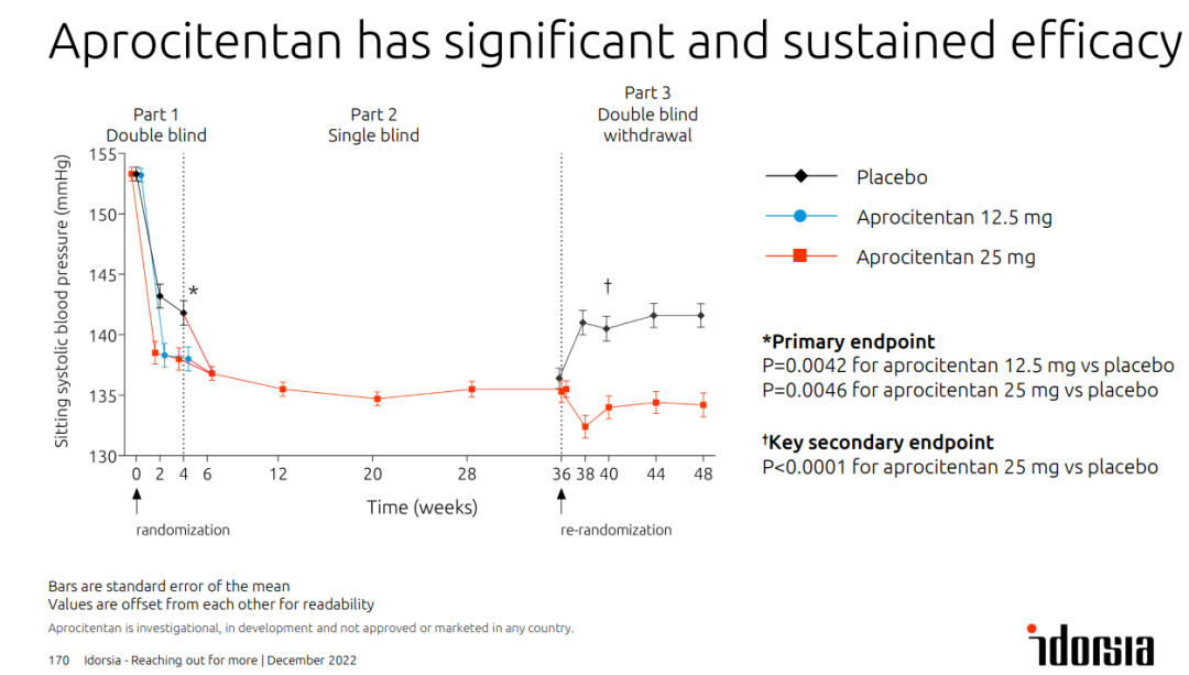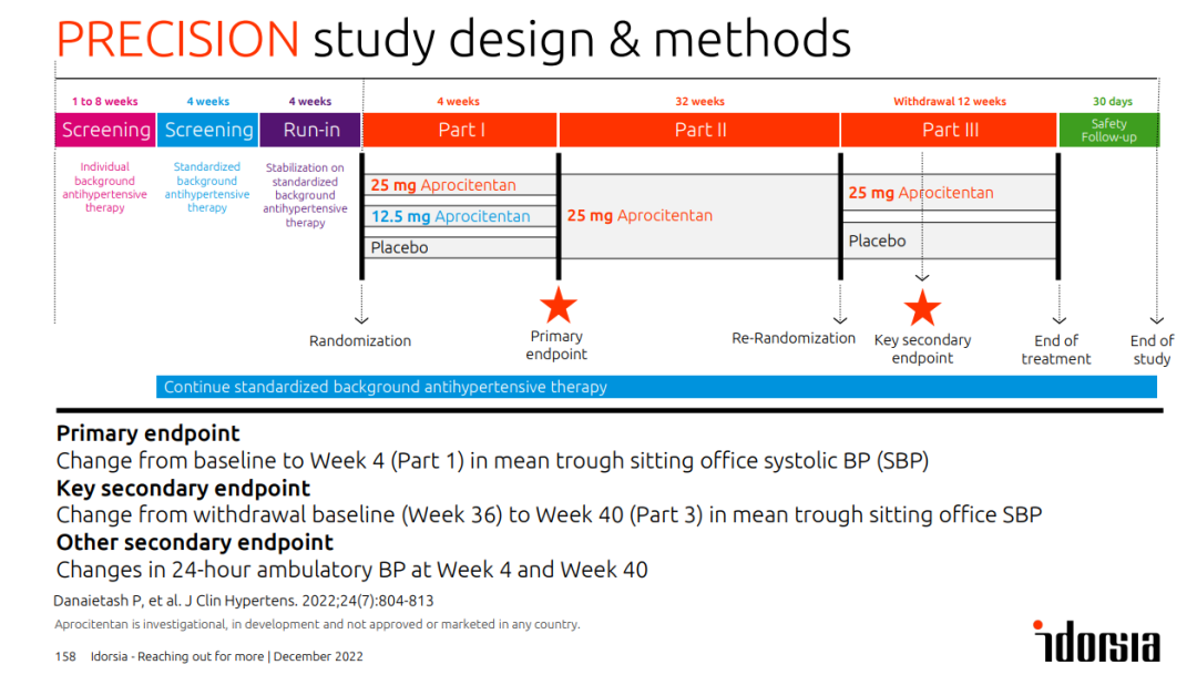 2022年11月,PRECISION研究的全部结果发表在《柳叶刀》杂志,并在2022年美国心脏协会 (AHA) 科学会议上作为最新突破性科学报告发表。12月,Idorsia宣布完成就aprocitentan向FDA递交的新药申请(NDA),用以治疗顽固性高血压患者。根据新闻稿,如果这款药物最终获批,将可能成为30年来首个基于新机制的降血压药物。