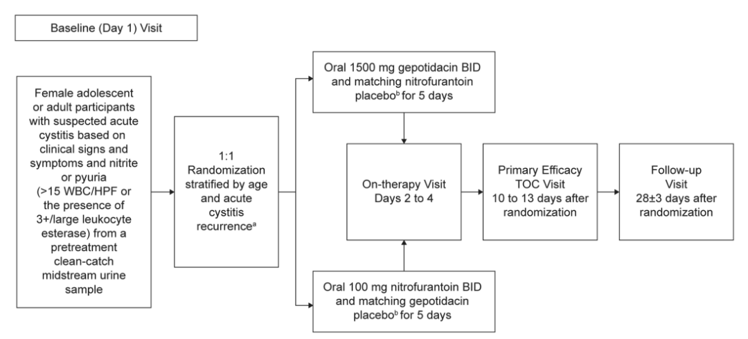 单纯性尿路感染 (uUTI) 是最常见的门诊感染,超过一半的女性在其一生中会患上uUTI,超过四分之一的女性患有复发性uUTI。EAGLE III 期计划包括三项临床试验:EAGLE-2和3是相似的试验,将共同提供了大量临床证据。EAGLE-2 和 EAGLE-3都是非劣效性uUTI试验,主要对比gepotidacin(1500mg,每日口服两次,治疗 5 天)和呋喃妥因(100mg,每日口服两次,治疗 5 天)的有效性和安全性,试验持续约28天。主要临床终点为在TOC随访时,具有符合尿道病原菌患者中,临床和微生物的组合缓解率。
