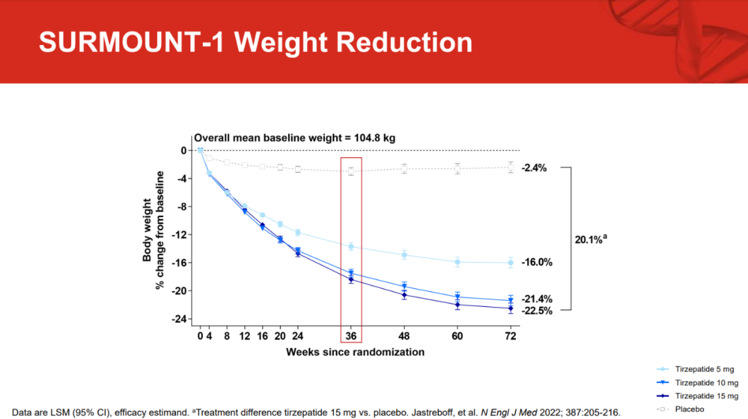 研究结果显示,5mg tirzepatide vs 10mg tirzepatide vs 15mg tirzepatide vs 安慰剂的平均体重相较于基线降低16.0% vs 21.4% vs 22.5% vs 2.4%。此外,体重降低超过5%患者比例为89% vs 96% vs 96% vs 28%。体重降低超过20%患者比例为55%(10mg)vs 63%(15mg)vs 1.3%,达到双重主要和关键次要终点。
