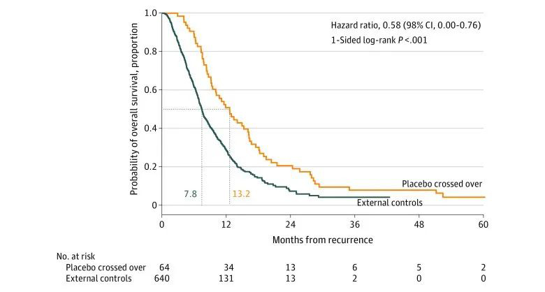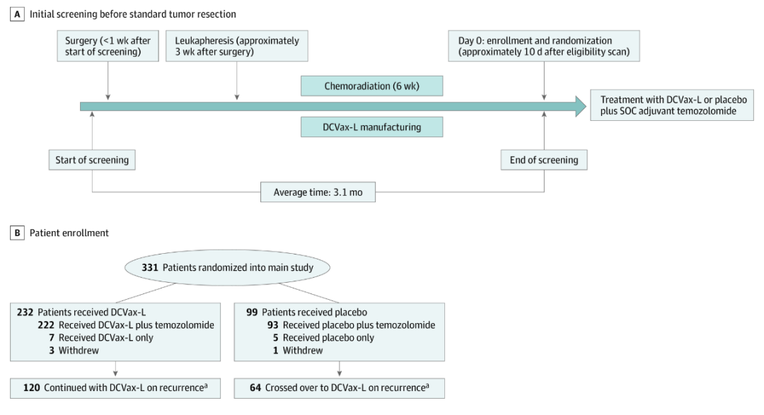 胶质母细胞瘤(GBM)是最常见和最致命的原发性脑癌,复发率近100%。GBM患者通常在初次手术后6-8个月内复发,患者诊断后平均仅存活15-17个月,5年生存率仅5.7%。该研究(NCT00045968)横跨20余年,共纳入331例患者,分为DCVax-L组(n=232)和安慰剂组(n=99)两个队列,其中安慰剂组有64例患者复发后接受DCVax-L治疗。最初预定的主要终点为无进展生存期(PFS),但NW Bio认为该指标不足以衡量疗效,后来将指标重新确定为nGBM患者的总生存期(OS),次要终点为rGBM患者的OS。