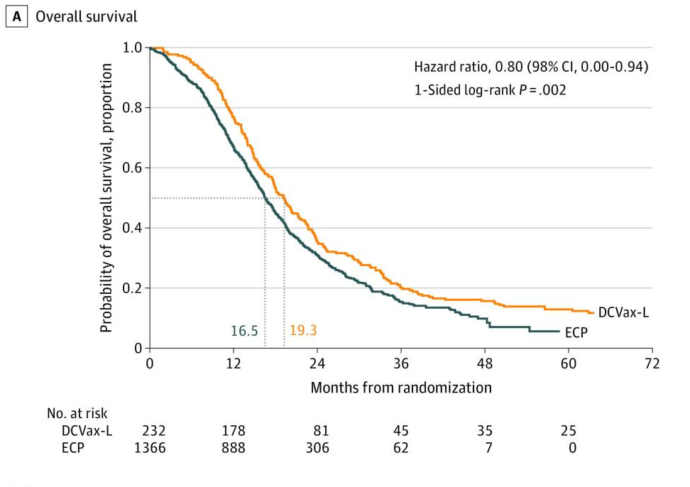结果显示,在nGBM队列(n=232)中,DCVax-L组患者的中位OS为19.3个月(手术后为22.4个月),对照组为16.5个月(HR=0.80,p=0.002)。此外,DCVax-L组和对照组患者的48个月生存率分别为15.7%和9.9%,60个月时分别为13%和5.7%。
