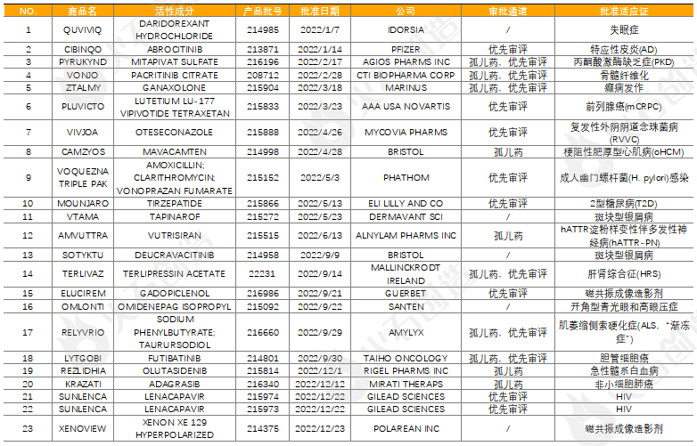 如图1,截至2023年1月5日FDA官网披露,2022年FDA共完成802项药品首次批准(不包含暂时批准),其中NDA/BLA批准121款(不包含暂时批准)。其中包括23款新获批的新分子实体药物(NDA:Type 1 - New Molecular Entity),见表1,25款生物制品药物(BLA)。
