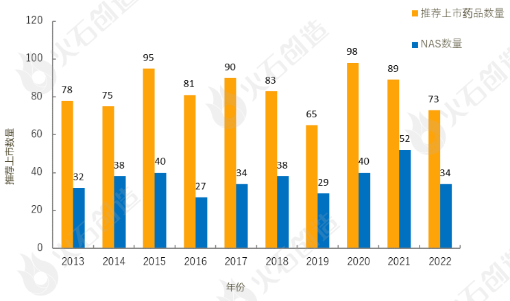 图2 2013—2022年EMA推荐上市药品数量变化情况 来源:火石创造产业数据中心