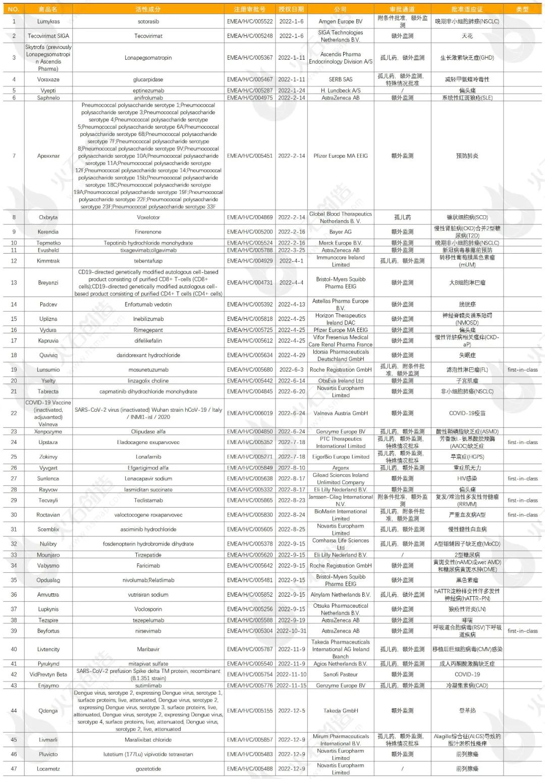 截至2023年1月5日,2022年EMA共授权96款药品上市,其中授权47款新活性物质药,包含6款全球首创新药(first-in-class)。研发企业中,AstraZeneca AB和Novartis获授权上市药品最多,均有4款药品,Bristol-Myers Squibb、Eli Lilly、Genzyme、Pfizer、Roche五家药企各有2款药品上市,位列第二梯队。详细情况如列表2。