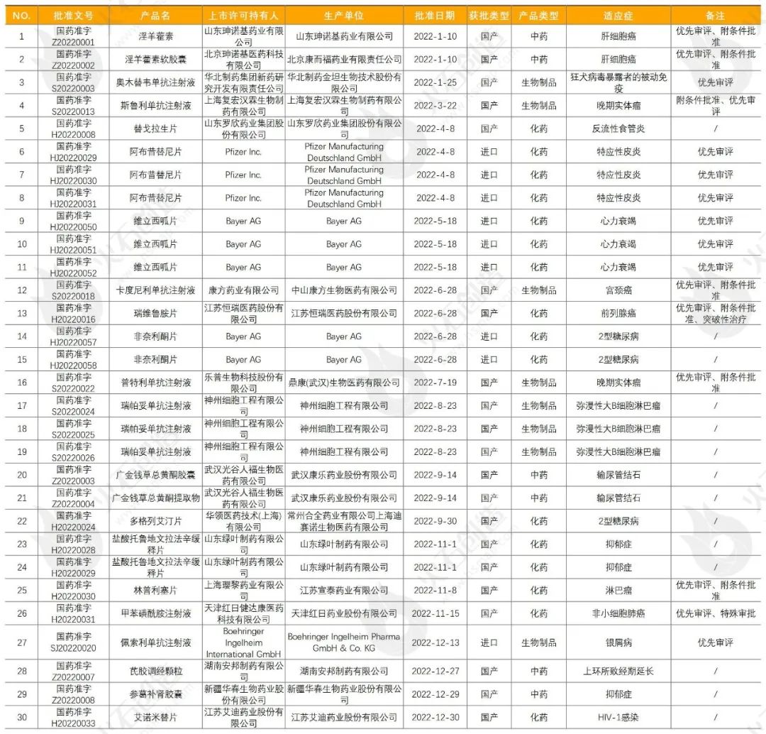 截至2023年1月5日NMPA披露,2022年共批准国产首次注册药品1001件。按剂型去重后,共428个药品品种(不同厂家生产同一药物按同一品种计算),共30个品规(22个品种)1类创新药获批上市,包含16个品规(10个品种)化药、8个品规(6个品种)生物制品和6个品规(6个品种)中药。按品规计,创新药获批同比2021年下降43.14%。2022年NMPA批准的1类创新药情况见表3。