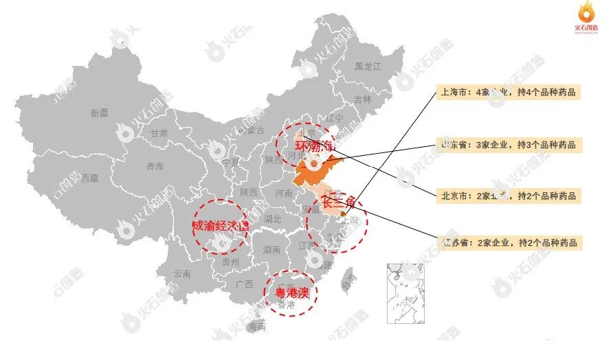 从地域分布上,2022年获批创新药企业最多的依次为上海市(4家企业,持4个品种药品)、山东省(3家企业,持3个品种药品)、北京市/江苏省(2家企业,持2个品种药品)几个区域,见图3。