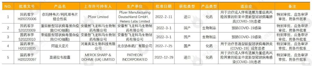 截至2023年1月5日,随着疫情防控政策调整,为预防/治疗COVID-19新冠病毒,2022年NMPA按照药品特别审批程序,进行应急审评审批,附条件批准了5个品规(4个品种)疫苗/药品的上市,见表4;同时,于12月30日,NMPA通过快速审评通道,批准布洛芬混悬液等12个新冠病毒感染对症治疗药物上市。