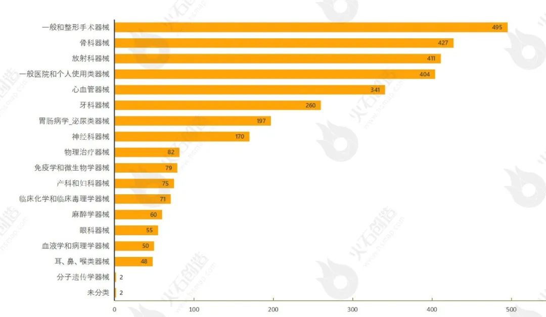 通过对510(k)上市前通知的器械根据美国医学专业用途进行分类,结果发现,2022年产品获批类型最多的为一般和整形手术器械、骨科器械、放射科器械、一般医院和个人使用类器械与心血管器械,见图5。
