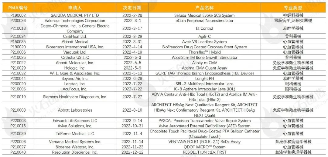 截至2023年1月5日,2022年FDA共批准3229个510(k)途径的产品,其中一类器械262个,二类器械2895个,未分类72个。2022年共有22个通过上市前批准(PMA)途径首次上市。
