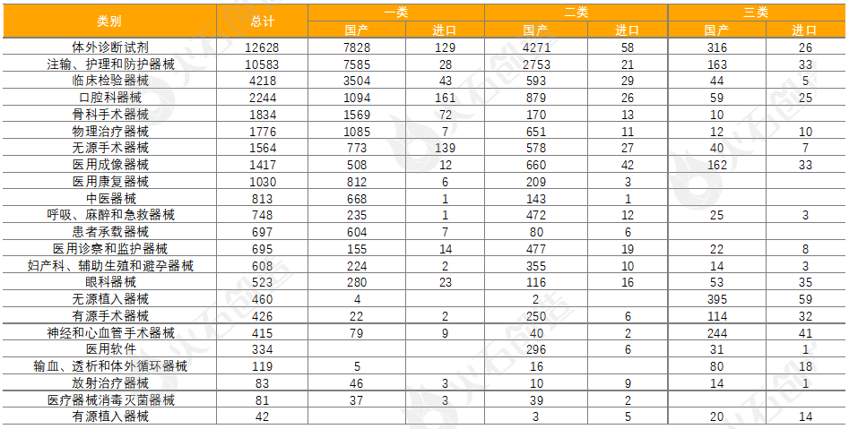统计数据显示,体外诊断试剂数量最多,共12628项,占29.14%,基本上均为国产,为12415项。除体外诊断试剂,批准注册类别数量排前三位的分别为注输、护理和防护器械,临床检验器械和口腔科器械。