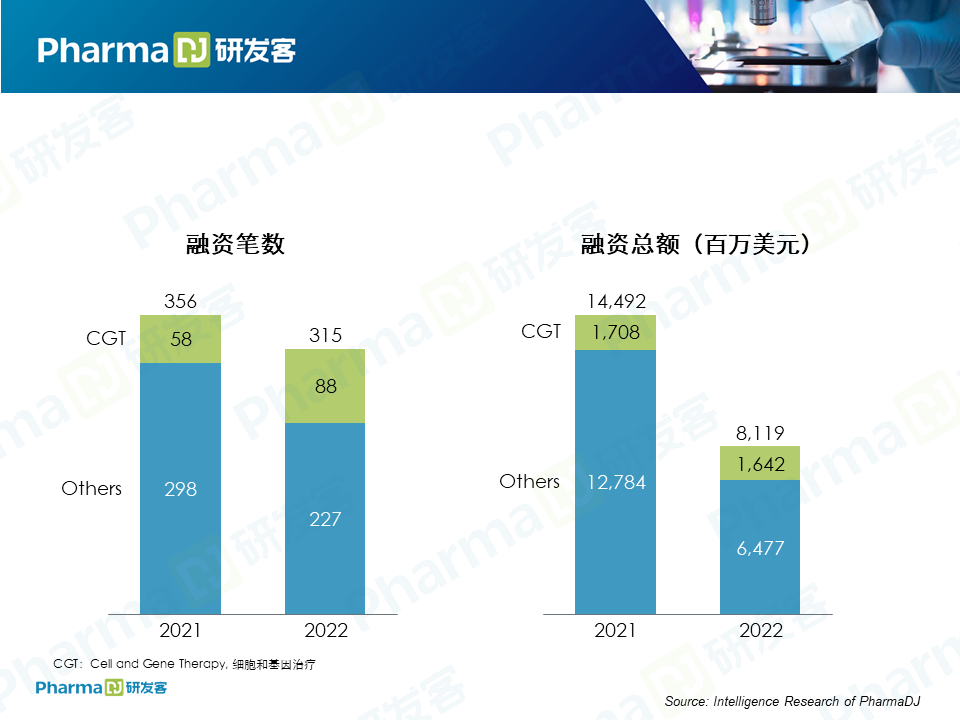 然而,在低迷的融资市场中,细胞和基因治疗(Cell and Gene Therapy)成为一缕亮光,吸引了众多投资方的关注,融资金额与去年持平,且融资交易数出现较大幅度的增长。