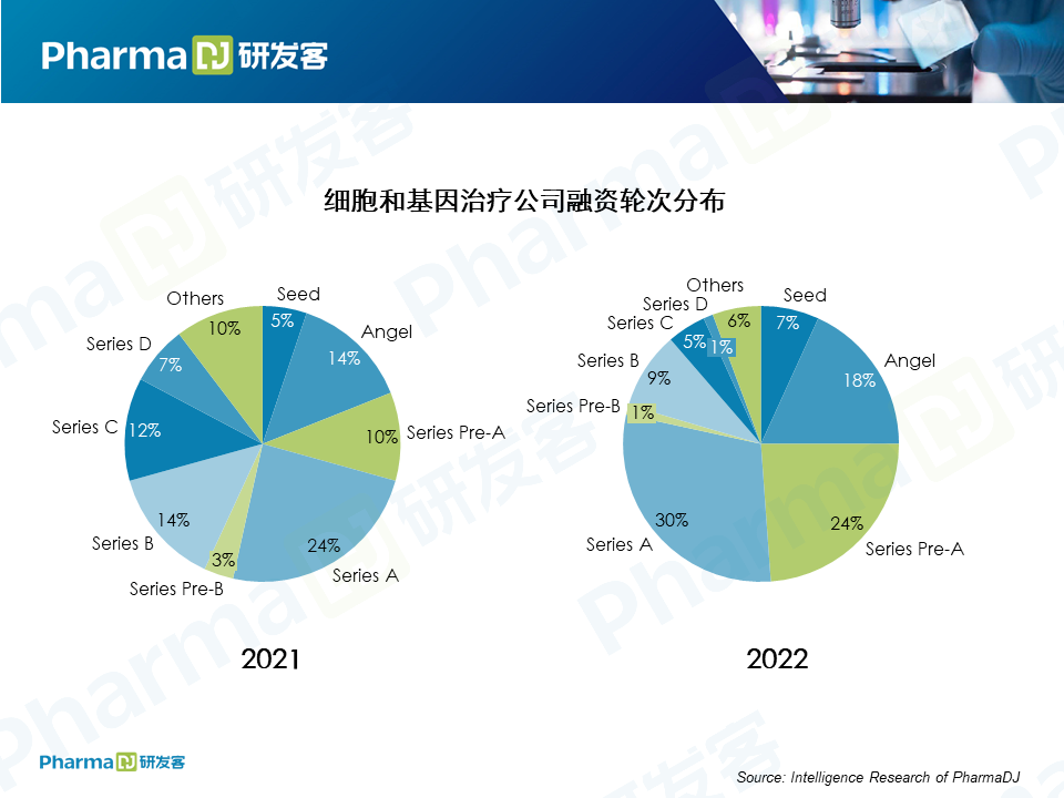 而研发客对过去两年细胞和基因治疗融资进行梳理后发现,尽管细胞和基因治疗融资交易笔数增长可观,但是融资主要集中在早期融资阶段,特别是Pre-A轮和A轮。这一趋势在2022年尤为明显,Pre-A轮和A轮融资占了当年全部该领域融资的54%。