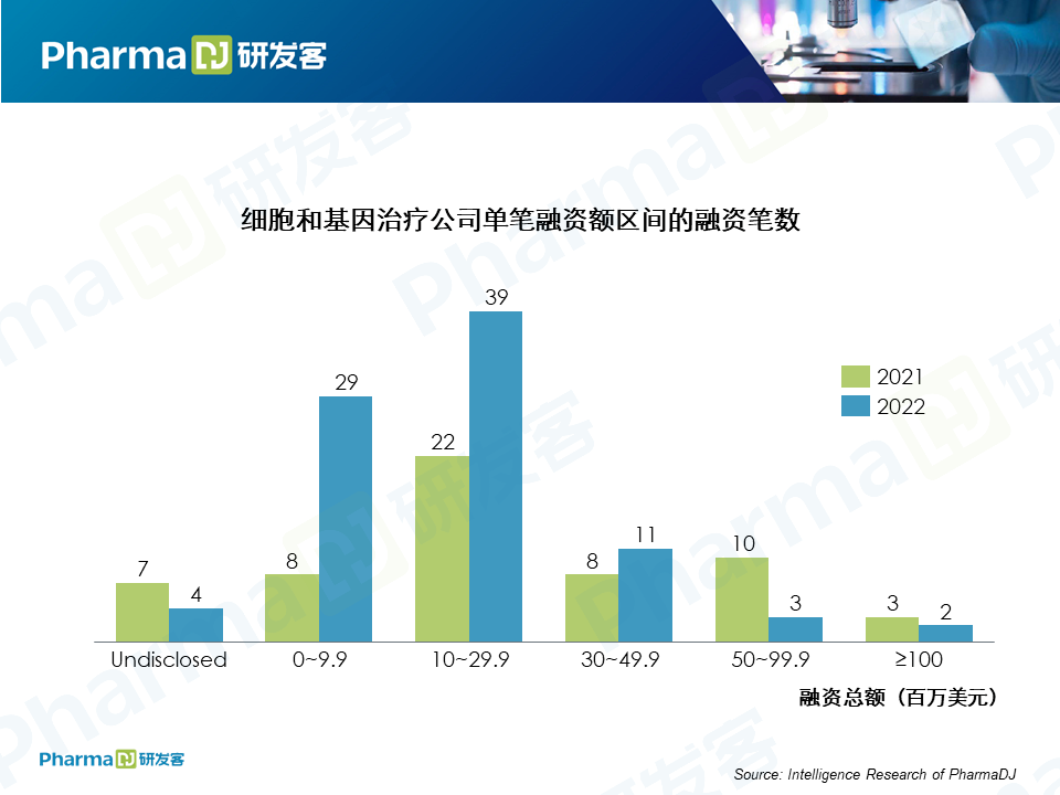 据研发客的统计,与2021年相比,生物制药开发公司获得融资的笔数和披露的融资总金额都出现了下滑。融资总金额下滑尤为严重,从2021年145亿美元下跌至去年的81亿美元。