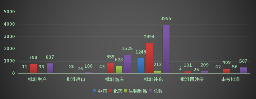 2022年CDE共完成审评的化学药共4981个品种(受理号7822个,包含无需技术审评的受理号);以申请类型计,新药申请541个品种(受理号1072个);进口申请296个品种(受理号578个);仿制申请1041个品种(受理号1380个),进口再注册186个品种(受理号370个),补充申请2865个品种(受理号4190个);