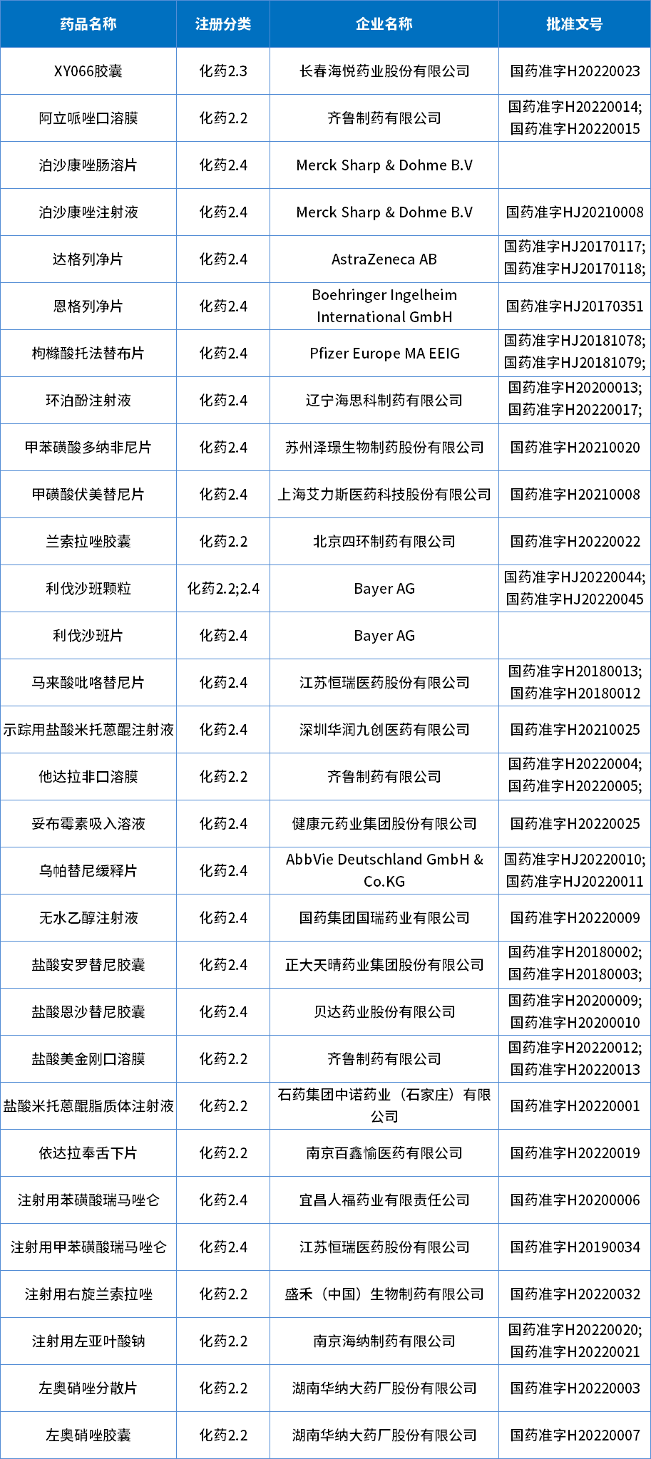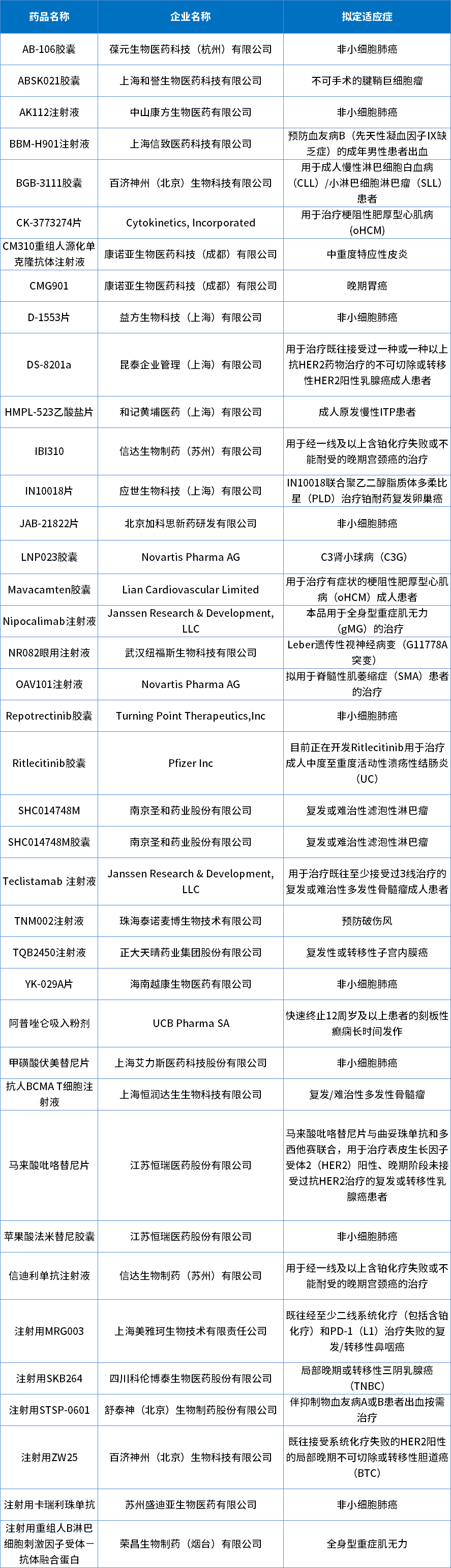表1 2022年批准化药1类创新药