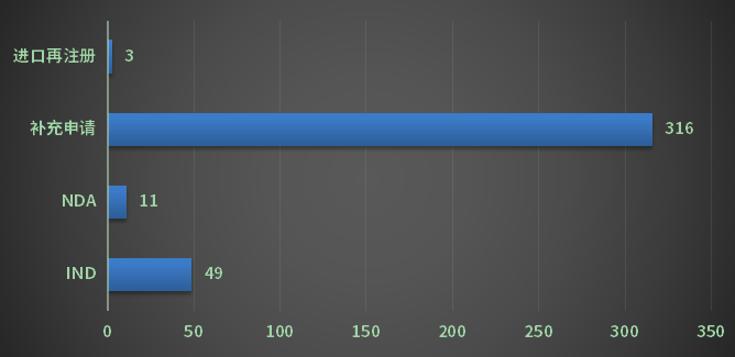 2022年CDE共受理化学药注册申请5483个品种(受理号8790个),以申请类型计,新药申请493个品种(受理号1029个),同比减少7.5%;进口申请293个品种(受理号582个);仿制申请1722个品种(受理号2303个),进口再注册168个品种(受理号350个),补充申请2741个品种(受理号4285个);