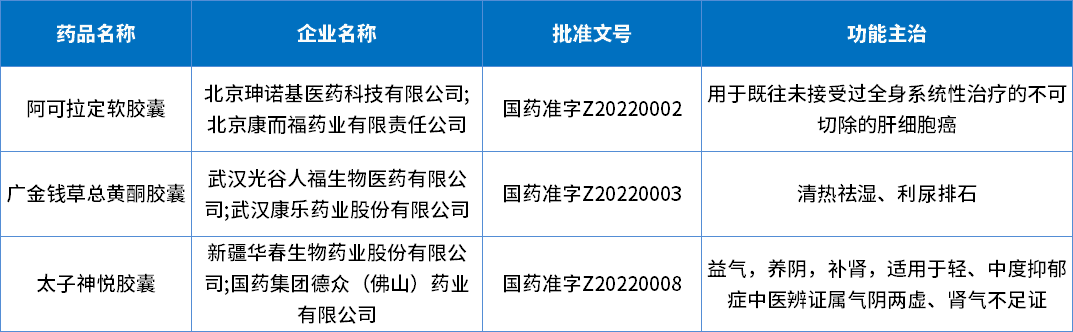 2022年中药创新药有4个品种获批上市,为太子神悦胶囊、广金钱草总黄酮胶囊、止血调经颗粒和阿可拉定软胶囊;2022年批准中药创新药详情见表3。