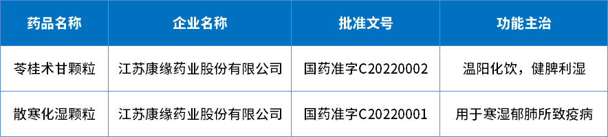2022年中药中药经典名方批准上市有2个品种,为散寒化湿颗粒和苓桂术甘颗粒,都为江苏康缘的产品;2022年批准经典名方详情见表4。