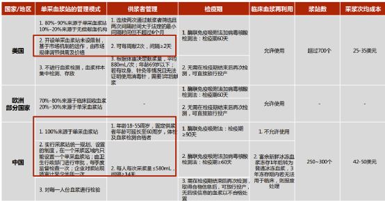 血制品行业浆站的数量、布局等规划会依据卫生部核准的全国生产用原料血浆需求来制定,基本成了计划经济。此外,在临床血液回收上,中国完全禁止了这一情况;并且,中国的血制品检疫周期较海外也长。