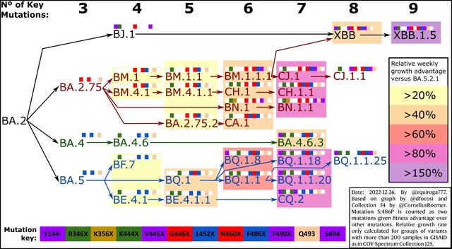 而XBB.1.5作为XBB的子分支,有着比XBB更多的变异,使其更具生长和传播优势。近来,奥密克戎变异株XBB.1.5备受世界瞩目。