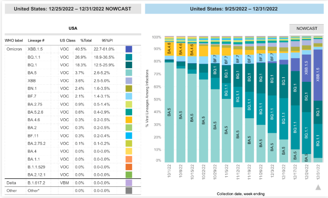 美国疾病控制与预防中心(CDC)提供的数据非常直观地展现出XBB.1.5毒株的超强传播力——仅去年12月24日至31日的一周时间,全美新增的XBB.1.5感染者在总新增病例中的占比从21.7%增加到40.5%;在美国纽约的流行比例远超XBB、BQ.1、BQ.1.1,占比超过70%;并在东部的10个州大规模传播。