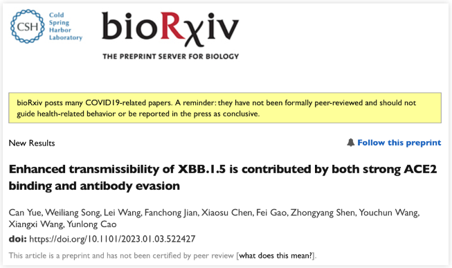 [1]Enhanced transmissibility of XBB.1.5 is contributed by both strong ACE2 binding and antibody evasion. Can Yue, Weiliang Song, Lei Wang, Fanchong Jian, Xiaosu Chen, Fei Gao, ZhongyangShen, Youchun Wang, Xiangxi Wang, Yunlong Cao. bioRxiv 2023.01.03.522427; doi: https://doi.org/10.1101/2023.01.03.522427