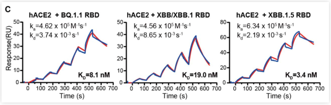 深度突变扫描显示,XBB.1.5与hACE2的平衡解离常数KD为3.4nM,远超过XBB.1(KD=19 nM)和BQ.1.1(KD=8.1 nM)。事实上,KD值越小,意味着解离能力越弱,即与ACE2受体的亲和力越强。