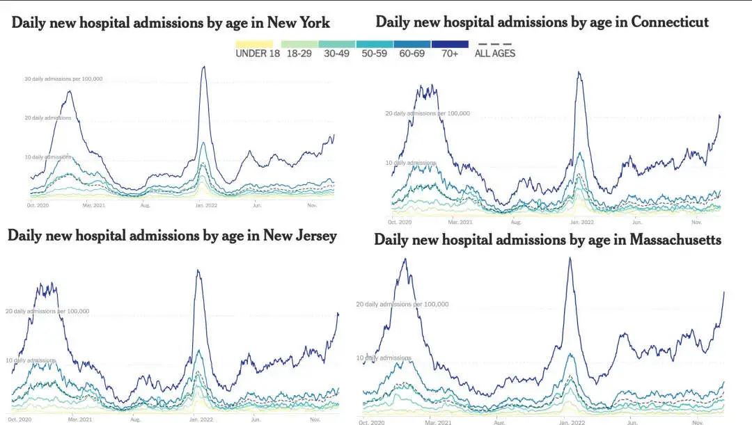 XBB.1.5在美国正处于快速增长时期,感染比例迅速上升。除了上文提到的高传播速度之外,不可否认的是,XBB.1.5确实在美国引发了住院潮,远超此前的BQ.1和更早期的BA.5,甚至接近第一波奥密克戎BA.1流行时的一半左右。