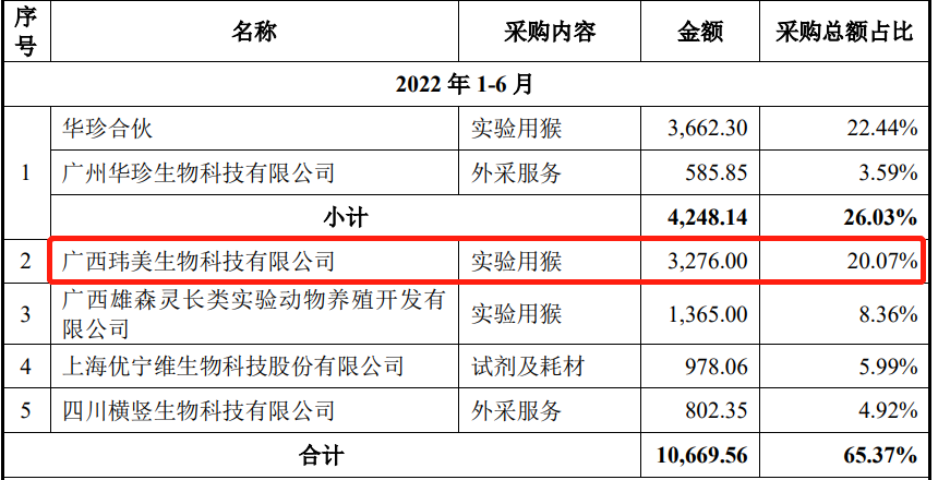 据益诺思的披露的五大供应商,2022年1-6月,昭衍新药收购的广西玮美生物,位列益诺思当期采购猴资源的第二位,采购额为3276万元,占总采购额20.07%。