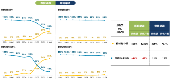 但值得注意的是,自集采2021Q2落地后,医院市场销售额同比下滑6%,而零售渠道销售额快速增长,同比提升11%,详情可参考下图。