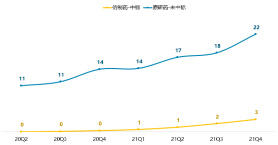 作为集采主战场的医院渠道,普拉克索仿制药的销售片数份额持续提升,2021Q3反超未中标原研药森福罗,直至2021年底中标仿制药在医院渠道已占据了81%的销售片数份额。2021年普拉克索中标仿制药在医院渠道销售额同比增长426%,销量片数更是呈现四位数的高速增长,未中标原研药森福罗受到仿制药的冲击,销售额同比下滑44%。