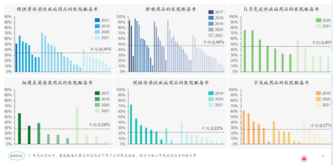 据RDPAC统计,国谈药品中,肿瘤药和自免类药品在样本医院的配备情况较好,配备率在45%以上;慢性非传染性疾病药品次之,平均配备率约为34%;而罕见病、细菌真菌感染药品及慢性传染性疾病药品的配备进度较低,平均配备率不足30%。