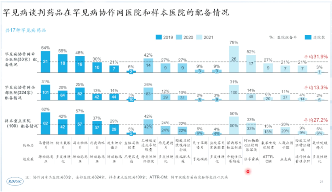 医院对国谈罕见病药品配备率低的原因有几个方面:零差率改革后医院药房转为成本中心,药房缺乏扩容的动力;虽然卫健委将国谈药品剔除出 “药占比” “药品总数量”等考核范围,但并没有明确激励医院配备此类药品的措施;部分药品的储存和使用要求较高,涉及药房软件、硬件的升级与管理人员的培训。