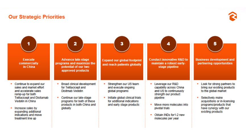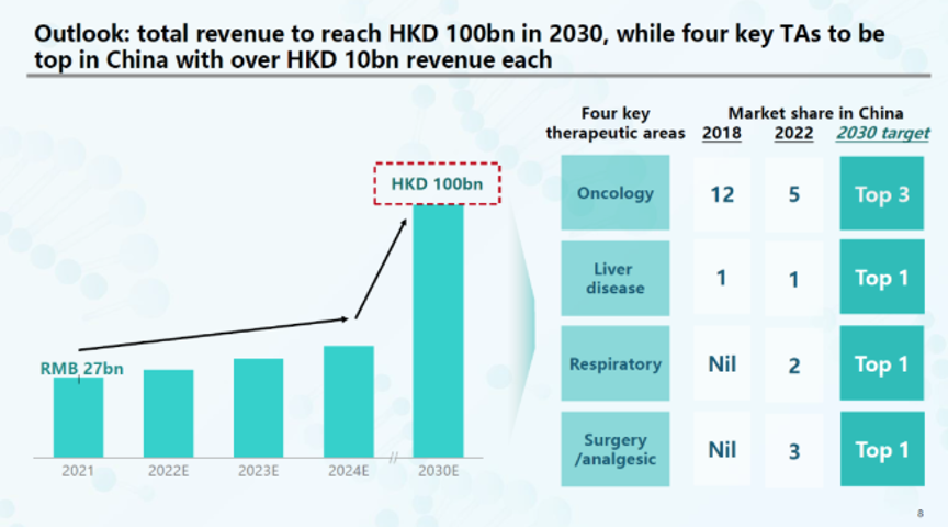 中国生物制药对于未来的希望是,在四大治疗领域做到中国的 TOP3 之内,争取在2030年跻身全球前30药企。