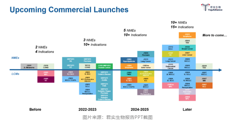 在2024-2025年,君实生物预计将有5个新分子实体获批上市,包括抗PCSK9单抗、抗BTLA单抗、抗IL-17A单抗、靶向EGFR exon 20的JS111等。2025年以后,将有10多个新分子实体获批上市。