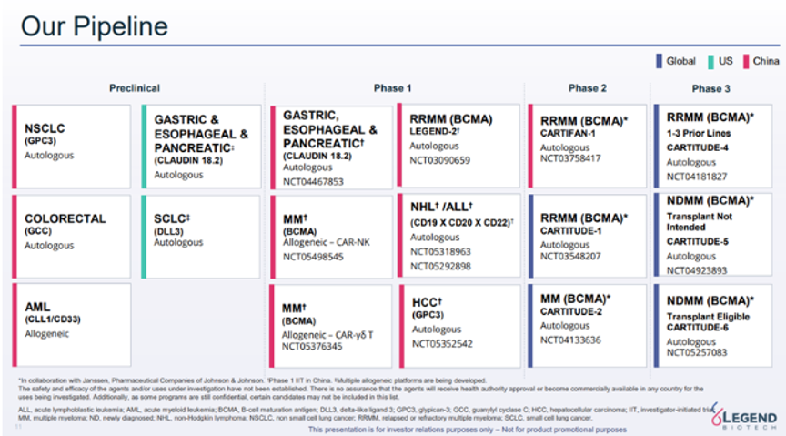 目前,传奇生物已在CAR-T、CAR-NK和CAR-γδT这3大领域建立核心技术平台,并拥有10个管线项目,覆盖恶性血液瘤和实体瘤。